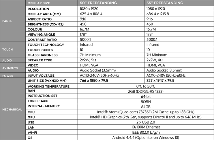 These screens utilize IR touch technology which provides excellent responsiveness and accuracy and is ideal for a commercial application as it features 10 Point touch technology all with the added benefit on a built-in Intel powered media player resulting in the ability to remove all other hardware requirements from your project!