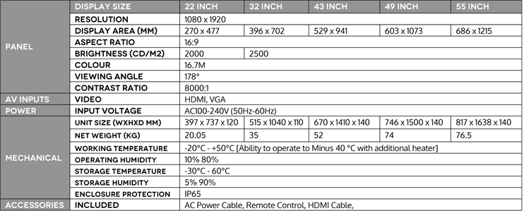 Brightness is paramount when using outdoor screens, these displays use commercial grade Ultra High Brightness panels (2500 cd/m2); more than 5 times brighter than a standard home TV to allow easy readability in direct sunlight.